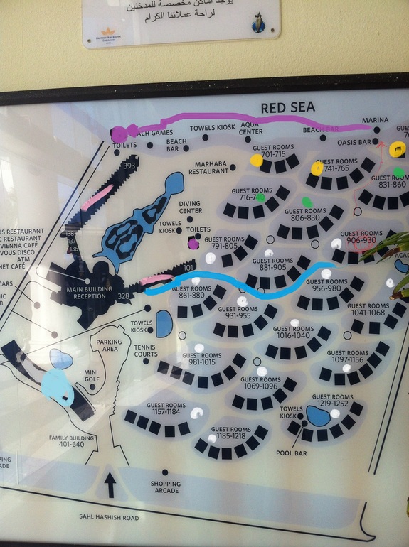 Также тонким красным наша дорога на пляж. Синим толстым дорога к еде. Далее, желтым это домики на первой линии , зеленым тоже другая категория, а вот белым (как у нас) это все эконом и тут видно какой можно получить домик на отшибе. Так что нам повезло для эконома. Розовым около ресепшена это номера в основном здании, и голубым слева внизу это семейные номера. Все это дороже нашего. И, внимание, толстой розовой линией нарисован наш путь до туалета на пляже!!!! Это ужас конечно, видимо лень убираться, опять сэкономили. Есть конечно еще один туалет у бассейна ( розовая точка) но до него тоже надо идти.
