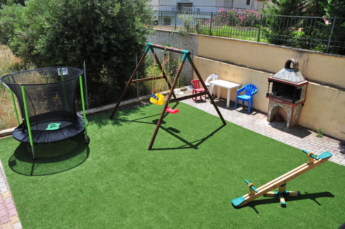 Вид на площадку сверху из соседних апартов. Большой надувной батут и надувная горка еще спущены...