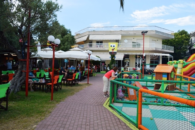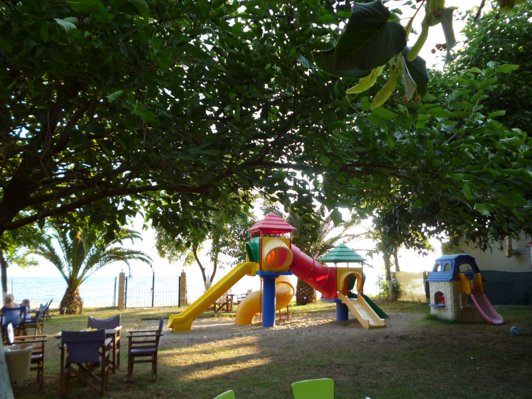 Еще вспомнила... Все таки две площадки аттракционов там есть. Одна рядом с пляжным баром. Очень милая, со столиками для родителей, закусками, напитками по меню. Ограждения для совсем малышей с малюсенькими пластиковыми горками, домиками и двумя нянями, батуты и качели для деток постарше тоже с няней и электромобили. За вход платишь 2 или 3 евро - неограниченное время ребенок там бесится +сок в коробочке и вода кажется за эти деньги... часто там проводят детские праздники - очень интересно наблюдать за греками....бежит такой маленький черноглазый карапуз а ему мама в след кричит "Аристотель!!!! Аристотель!!" )))