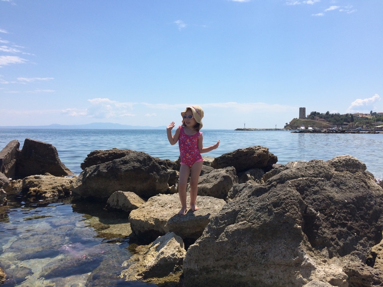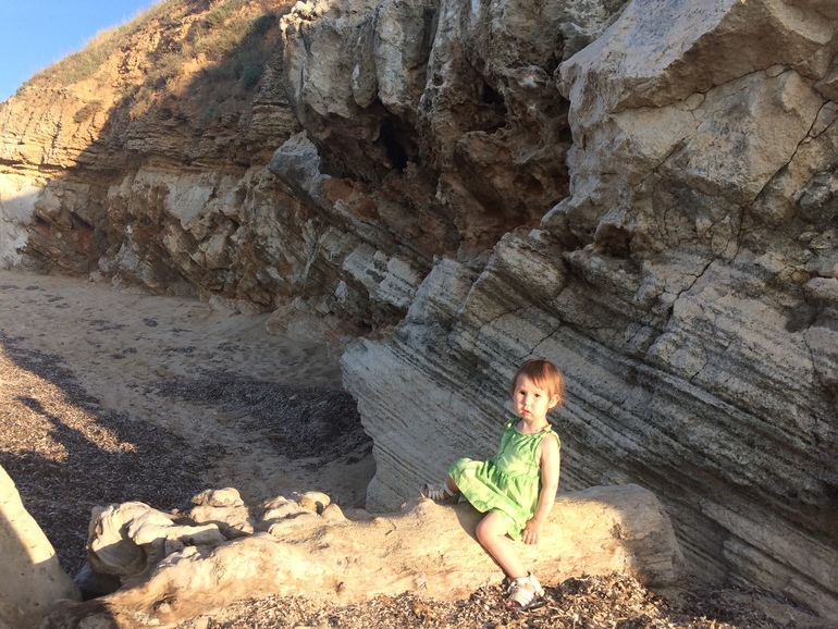 Возле таких камней живут морские ежи, плавает много красивых рыбок и ползают крабы. Дети бегают и с интересом их разглядывают. Что здорово, на входе в море морских ежей нет, дети спокойно бегают, и можно не волноваться...