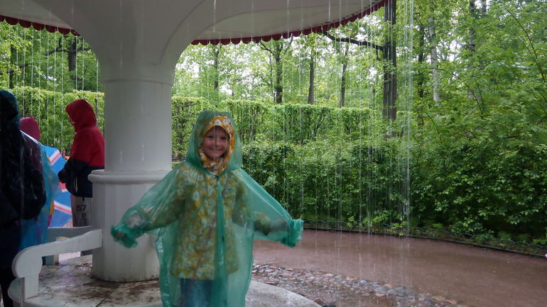 Единственное, что скрасило Вике досуг- это фонтаны-шутихи. не смотря на обилие воды, льющиеся с небес , ребёнок соизволил ещё и там поплескаться.