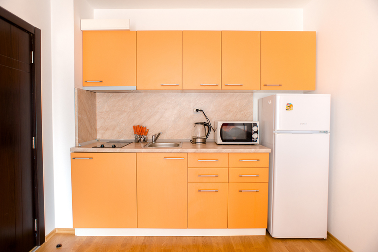 Полностью оборудованная кухня: варочная панель, духовой шкаф, вытяжка, холодильник, стиральная машинка, микроволновая печь, электрочайник, кухонная посуда, столовые приборы.