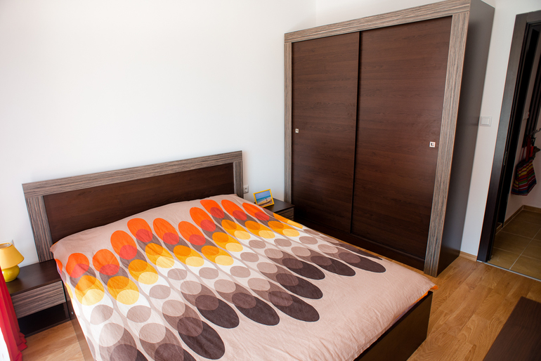 В спальне: двуспальная кровать 160х200см., комод, 2 прикроватные тумбочки, большой платяной шкаф.