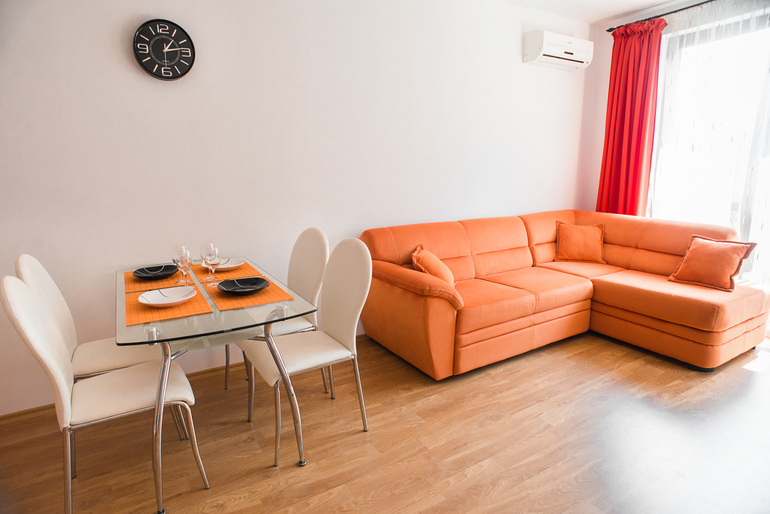 В гостиной: раскладной угловой двуспальный диван, стенка, кондиционер, телевизор.