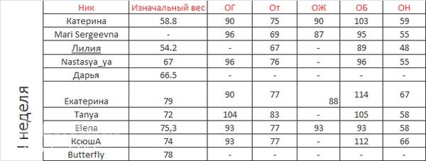 у меня сегодня второй день, вес 76,4 это радует))) параметры как обещала ОГ 100, ОТ 71, ОБ 108, ЛЯХА 61, РУКА 33