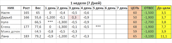 Не за что! Обязательно внесу, но тут накладочка- смогу внести все в понедельник и рост (и отвесы за пятницу, субботу и воскресенье), так как в срочном порядке уезжала с работы (ребенок заболел(((, и забыла на флешку качнуть таблицу. Так что сразу Сорри, в понедельник все сделаю и подведем итоги первой недели.