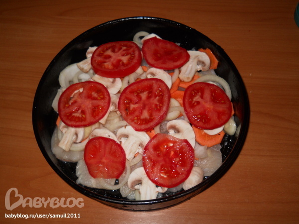 2. Хек с овощами в дкховке (перед запеканием):
