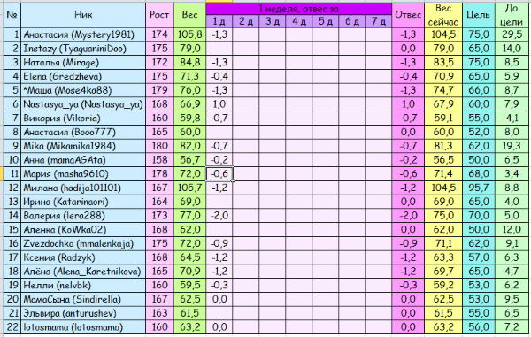 Всем привет! Начала диету с 7 января, 1 день - -1300,00, 2 день- -100. Можно и меня в табличку занести? Вместе как-то веселее. Спасибо