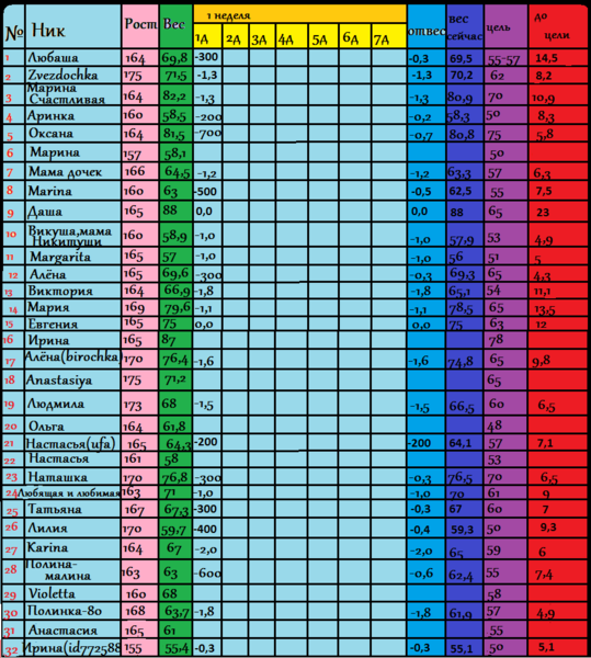 Наши отчеты и результаты:)Вот и наша табличка. Одна из девушек Violetta почему то была в этом сообществе сегодня, но отчет не оставила..по непонятным для меня причинам. Поэтому прошу тех,кто не хочет быть в табличке,мне об этом написать,и я вас вычеркну!Чтобы не сидеть вас и больше не ждать!