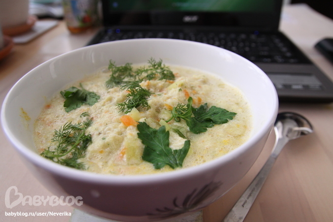 Куриный супчик: отварила в воде курицу, доварила на вторичной воде с луком и 3мя кусочками моркови (для цвета больше) 5 минут, вынула часть, остальное взбила блендером, вернула большие куриные куски, добавила зелень, специи, соль.