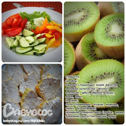 Внимание ужин: Салат (помидоры, огурцы, морковь, перец без заправки), а вот в категории Информация о диете Магги: Суббота Ужин: жареное или вареное мясо (ломтики или фарш без жира), кроме баранины, салат