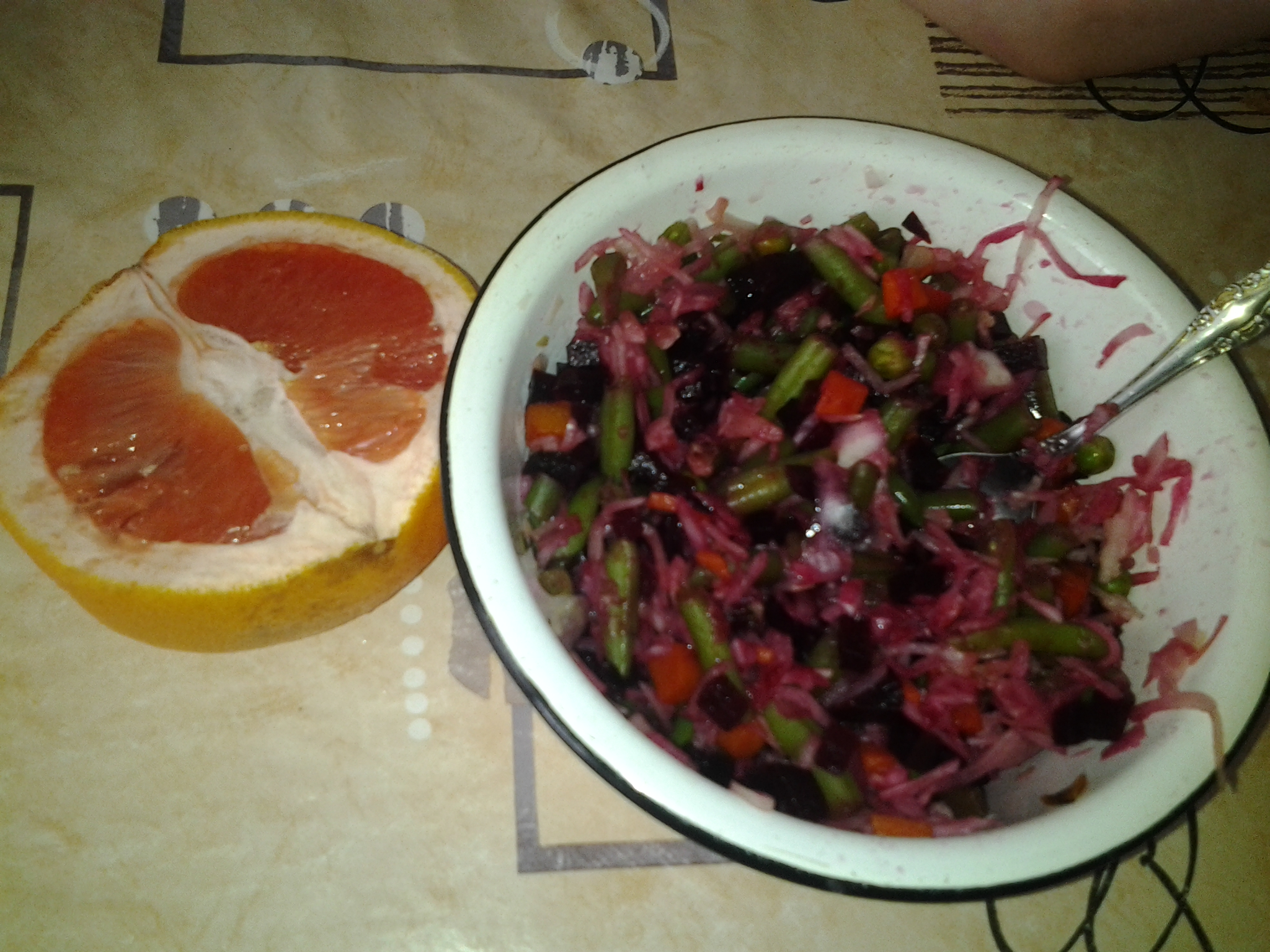 Мой винегрет состоит из:свекла,морковь,фасоль стручковая,горошек мороженый,капуста квашеная...соль я не добаляла тк за счет капусты и так вкусно!!!