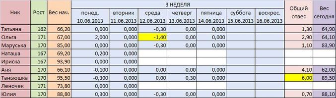 Может давай без таблички? Хоть в личных сообщениях рассказывать об ощущениях? Осталась неделька всего, даже не верится)) А у меня поменьше вес ушел за выходные (на кг всего) но вчера ходили на ДР, съела две столовых ложки тушеных овощей и пару чайных ложек торта. По сравнению с твоим весом мне еще худеть и худеть))) Сейчас 85,8)) Хочу увидеть цифру 7! Может на второй круг пойду. На четвертой недели меню прям разнообразное, прям боюсь что вес вверх поползет...сейчас пойду закупаться мясо-овощами-грейпфруктами))