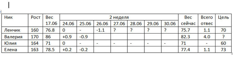 Привет, стройнеющим! :) Лена, подскажите, пожалуйста, как вы табличку вставляете, а то у меня только текст вставляется без рамки. :(( Заранее спасибо.