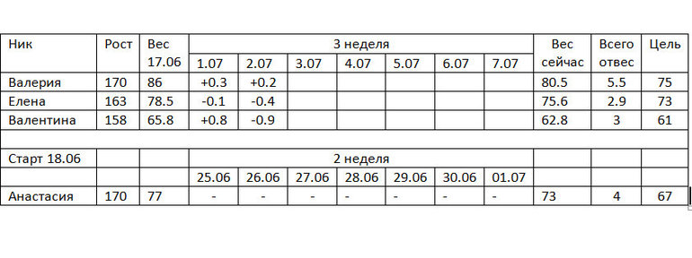 Вчера искала вас здесь и не нашла,думаю,где же новая табличка,а вот где вы:)Вес на сегодня 72,500, уходит оч.медленно,я думаю из-за КД.Ну что ж,стройнеем дальше;)