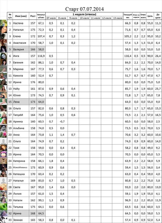 К сожалению, у нас есть уже сошедшие с дистанции. Могу сказать лишь "спасибо, что предупредили!" Давайте я всех предупрежу сразу, если вы сорвались и сошли с диеты - напишите об этом мне, можно в личку. Если вы не отчитываетесь неделю, я вас автоматически убираю из таблички. Народу много, табличка большая и мелкая, без обид!=)