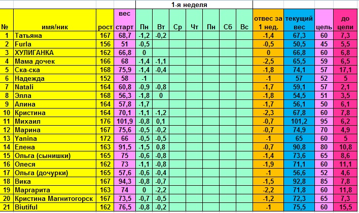 Всем приветик!!! Я №19 у меня сегодня -300, вес 71.5! Я оптимист и не расстраиваюсь! Буду грушки кушать и фаршик вечером))) Всем хороших отвесов и хорошего настроения!!!