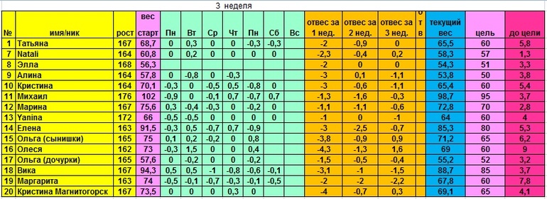 Всем привет, я не буду пока взвешиваться, пока не увижу свои щиколотки...отекла( Ян пиши пока нули, а то боюсь привес меня деморализует, а так постараюсь исправить вчерашний косяк)