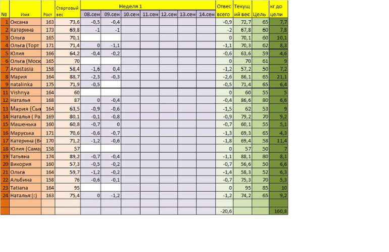 Как правило на 3-5 день начинается маленький + и вес потом будет уходить по 100-200 грамм - и ЭТО НОРМАЛЬНО!!! В первые дни уходит вода, а вот жир уходит очень медленно!Не опирайтесь на вес - сделайте замеры и вы увидите как к концу четвертой недели у вас уйдут обьемы... при этом по весам может уйти совсем немного-3-4 кг!!!