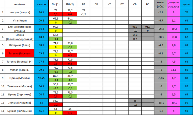 И у меня по нулям(((( 86,7 кг Я правда вчера поздно вечером арбуза налопалась, он был такой вкусняшный....Так что очень надеюсь на завтрашние показатели!