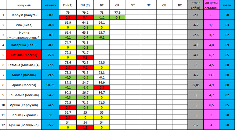 ты герой!!насчет второго круга, я подумаю... но меня результаты этого круга пока не утешают (((просто Лена (из Рязани) легла в больницу с дочкой и написала мне, что со мной она готова хоть на край света на второй круг пойти )) Но я пока думаю, у меня октябрь — месяц сложный. Командировка в Москву на неделю и ДР дочки — я что-то оч.сомневаюсь, что у меня получится второй круг