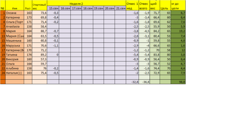 Оксана, пожалуйста, восстанови меня в своей таблице. Я и вправду не могла ни взвеситься, ни связаться с вами.