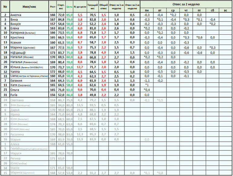 Приветик девочки и Кристина!))))номер 3 по нулям.Кристин,я табличку не проверяла,где то не правильно,у меня вес сейчас 82,6 !Поставь сегодня -200, чтоб дальше правильно было!)Спасибо!)))))