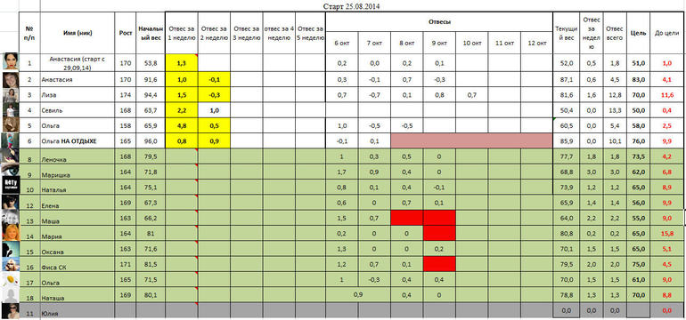 Красненьким отмечены те, кто не отчитался. Девочки, у меня к вам большая просьба, если по каким либо причинам вы не сможете отчитаться (т.е. вы заранее знаете о том, что у вас не будет компа, телефона, весов, и т.д.), пожалуйста, давайте об этом говорить. Заранее спасибо.