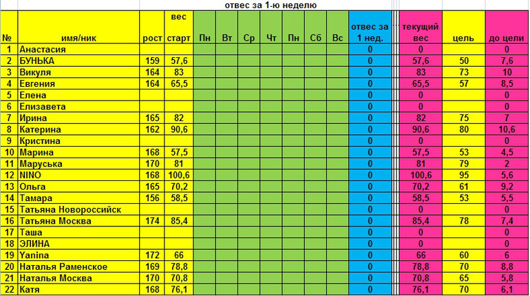 И так начнем, пока я всех не запомнила, Кристиночку, Леночку и Катюшу это не касается), пишем свой номерок в табличке, ваш рост, стартовый вес, и желаемый результат, (проверяем меня никого я не забыла?). Мотивация у нас такая)!