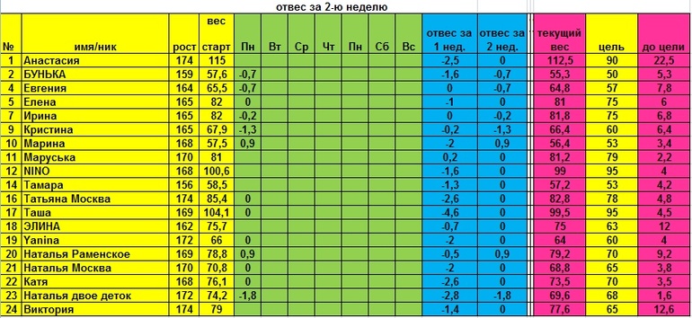 Дневник худеющей:)Привет мои дорогие!!! Я сегодня целый день буду отсутствовать, поэтому за вами при глянет Кристиночка! Вторая неделя у нас началась практически у всех с 0, я так поняла мы закрепляем результат)? Есть и отличившиеся в хорошем смысле Наташенька №23 и Кристина, Бунька, Евгения и Ирина, молодцы девчонки! Всем хорошего дня!!!