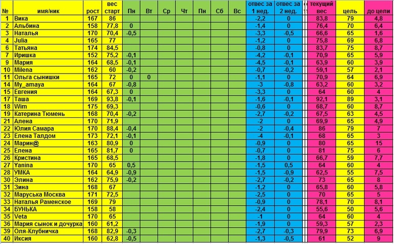 Вечер добрый ! №17 сегодня ноль.Ян у меня вес 93,7,я двоечки ещё не видела,подправишь в таблице? Завтра будет привес,я сегодня морально разлагалась с подругой