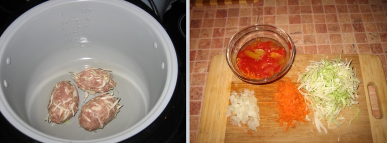 Рецепты диеты:)Всем приветик, вот решила поделиться рецептом ленивых голубцов. И так у меня фарш из свинины и говядины, капусту белокочанную мелко крошим, немного оставляем для тушения, остальное смешиваем с фаршем. Формируем голубцу, я обжаривала в мультеварке без добавления масла, с обеих сторон. Достаем голубцы, обжариваем лук репчатый, морковь, капусту, у меня еще были замороженные помидоры (их надо разморозить перед применением) и туши это дело минут 5, затем добавляем к ним голубцы и продолжаем тушить около 40мин, можно еще добавить водички к ним что-бы не пригорели. Я включала мультиповар на 100гр, время 40 мин, но нужно посматривать, т.к. воды выкипает.