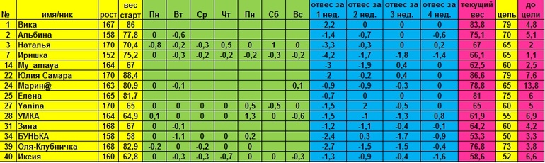 Всем приветик!!! У меня привесище в 2 с лишнем кг.правда я вчера поменяла батарейка у весов. И плюс эти к.д.ааааа я косяк.начинаю заново.надеюсь все пройдёт на ура.Янчик спасибо за участие.