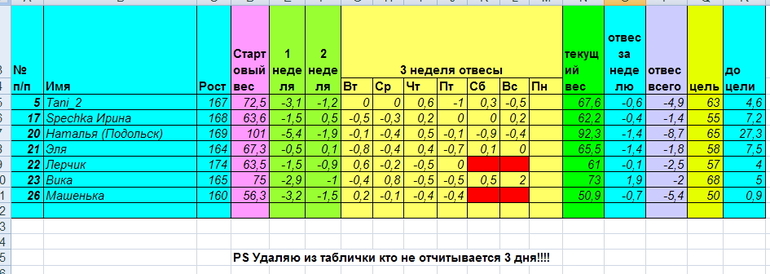 Всем привет!В субботу отвес -0,1, в воскресенье -0,6. Т.е. я дошла до 50,2 кг. Почти цель, и на этом все :) Я слезла с диеты, ходила в кафе, ела все подряд :) Так что 4-ю неделю вы уже без меня. Все большие умнички! Держитесь! А мне и в правду хватит, девчонки в кафе сказали что у меня лицо как у скелета стало ( Что я сильно похудела. Так что теперь +2-3 кг не страшно ))) P.S. Сегодня напишу пост-отчет с фото.