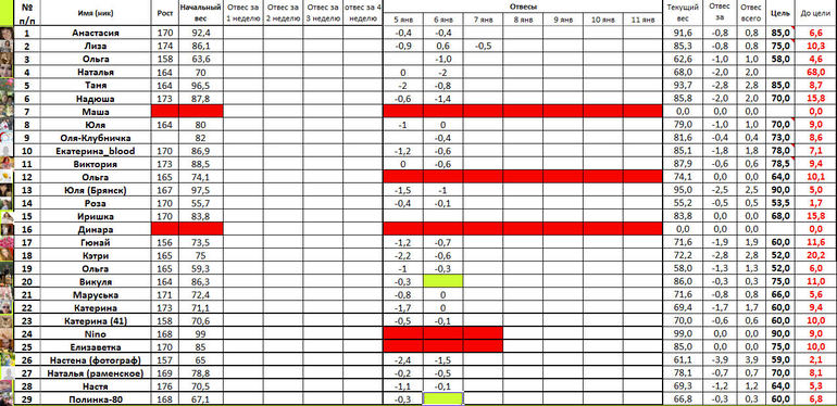 Красным, отмечены девочки, которые долгое время не выходят на связь. Жду до конца недели. Если не объявятся, увы, придется вычеркнуть.