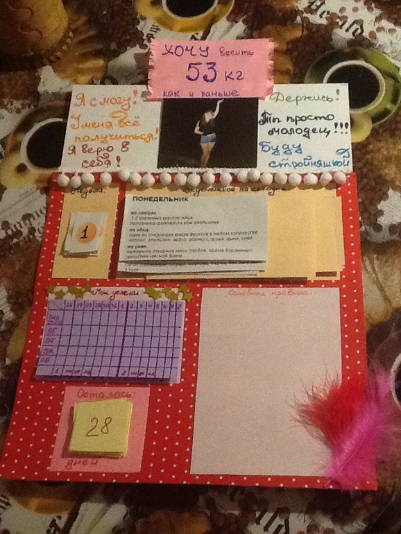 Дневник худеющей:)Девочки привет! Завтра начинаю диету! Продукты куплены!подготовила себе вот такую стимуляшку-напоминалочку (не судите строго-делала ночью когда доченька спала:)
