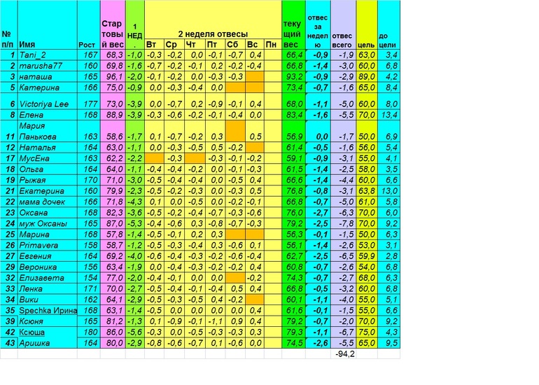 Дв.Девочки всем желаю удачи!!!!!Ухожу на -60 что то одни привесы у меня (((Спасибо за компанию всем дойти до конца с отличными результатами)))