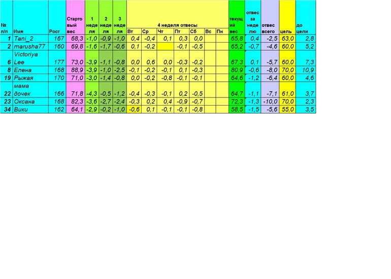 Номер 34,+200,58,700текущий вес...девочки мы молодцы!поздравляю всех вас с финишем..я еще не решила как быть дальше..может нще 2 недели на магги посижу 2 и 4 недели,может на любимую...в общем определяюсь еще..думаю табличка завтра не нужна,тк многие уже сегодня сходят с дистанции т завтра свои привесы смысла нет писать..всем удачи девочки!желаю каждой из вас дойти до намеченной цели???