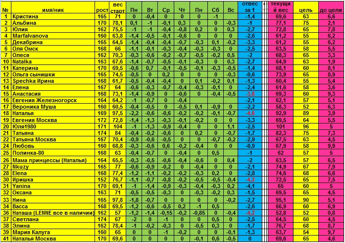 спасибо, спасибо))))) мой рост 168, вес начальный 79,9кг., стремлюсь к 64 кг.