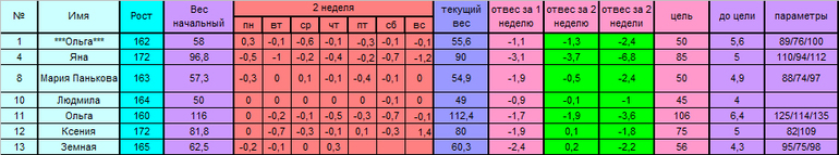 Привет) Я тебя больше сбаламутила вчера. Я на третьей неделе сейчас, утром хотела еще с первой начать, но яиц в доме оказалось и творога. Съела фруктовый салат. Пойду я по третьей неделе, посмотрим на результат потом.Вес сегодня 89,9  - 100 УРААА))) Первая восьмерка!)) Параметры тоже радуют:ОГ 102  (-8 изначально) (- 4 по сравнению со второй неделей)ОТ 85 (-9) (-4)ОБ 108 (-4) (--3)Больше сего меня поразил объем живота, замеряла для себя Начало 115, сейчас 100, это — 15см!!!!!!!!!!!!
