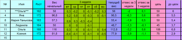 За 3 недельку у нас у всех отвесов практически нет, в лидерах у нас Ксюша с отвесом -1,1кг, у всех в основном+)