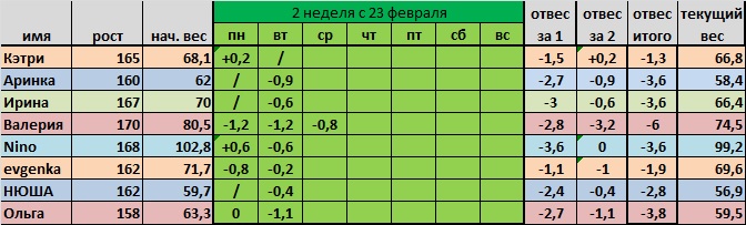 Привет! Опять проездили вчера весь день по делам-не успела до весов добраться, а на ночь выпила мнооого воды. Прям пить хотелось-в итоге сегодня всего -300гр на весах. Сегодня если муж раньше приедет пойду побегаю. Тоже помочь должно) Такие дни эти голодные по меню-завтра легче будет-рыбка нямням) А у тебя вообще суперотвесы-ничего себе как вес вниз пошел!)))