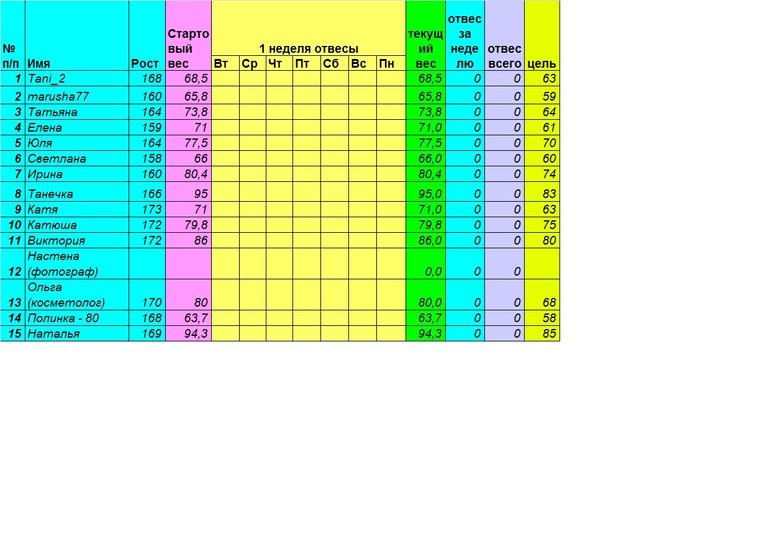 Привет! 12. В прошлом посте ответила, что начальный вес 63 кг, рост 157 см, ог 90, от 75, об 97. Цель 59 кг. Отметь меня в табличке, пожалуйста!Отвеса за 09 марта нет, на утро 10 марта вес 63 кг.