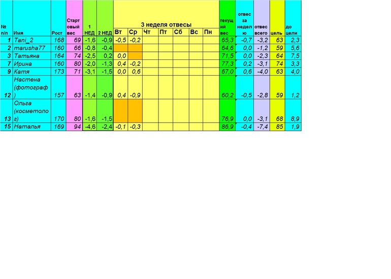Приветик, девчонки!№ 15, отвес -0,1 кг, вес 87,8Да уж, трудновато, третья неделя для меня всегда была самой тяжелой. Тем не менее, идем дальше, маленькими шажочками, но идем!