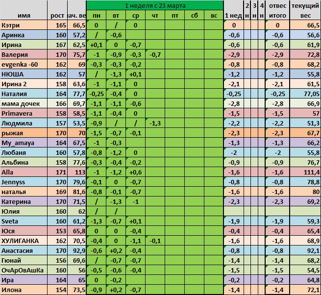 Девочки давайте отчитываться только так как я прошу, и ни как по другому, это ведь я заполняю таблицу, значит мне так удобней! отвес за ДЕНЬ ( можно ха 2-3 дня ТОЛЬКО ЕСЛИ ВЫ ЗА НИХ НЕ ОТЧИТЫВАЛИСЬ)и текущий вес. И пожалуйста ни как по другому.
