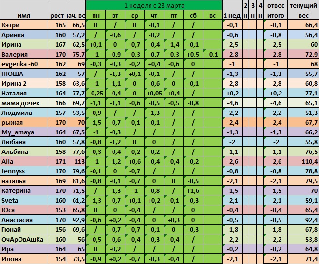 Привет,утром не могла отписаться, простите засланку. У меня +600,вес93 ровно, пустая неделя,начались кд, налеюсь все сдвинется. Девочки молодцы! Всеми горжусь, собой не очень, но все ожидаемо, я на магги с 2011 года, вес сбросила со 123 до 89, за зиму наела 4кг, но мы справимся-100%