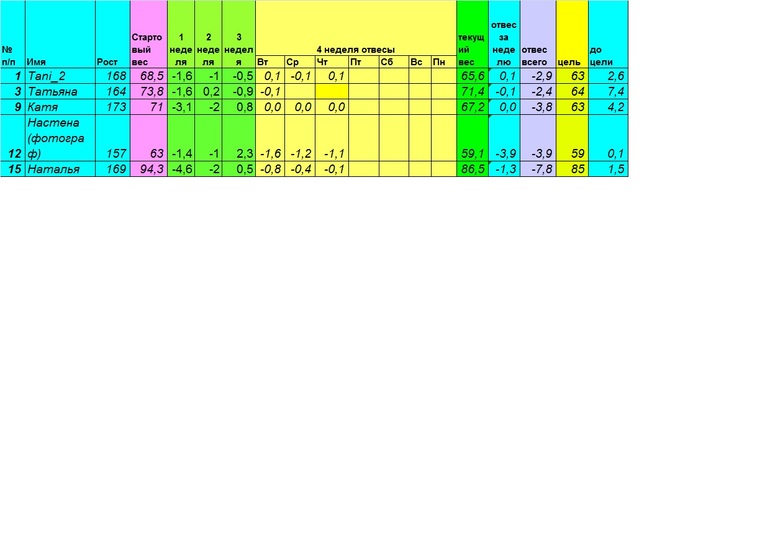 Приветик!№ 15, сегодня 0.Девочки, я довольна своим результатом, хотя цели 85 я не достигла.Значит все еще впереди! Всем удачи и хорошего настроения, надеюсь солнышко нас порадует в ближайшее время.Даю себе отдыха три дня, и буду двигаться дальше.