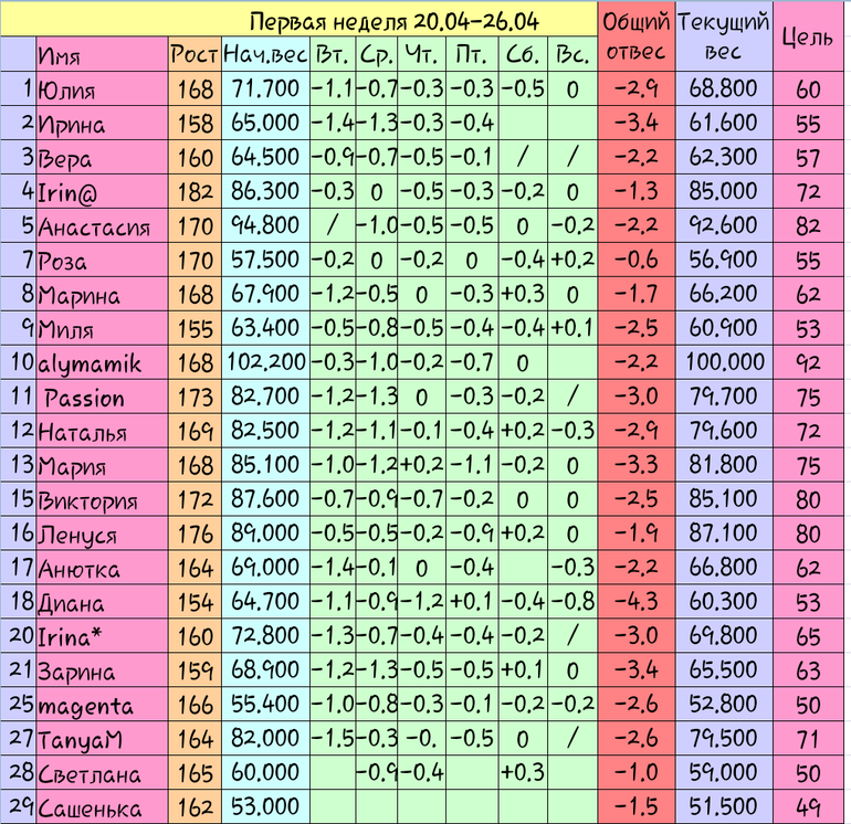 Девочки здравствуйте,сижу с вами с начало диеты,но свой вес постеснялась написать.И так за неделю ровно -5кг(изначальный вес 105,2).Если можно,внесите меня в таблицу,вес могу по дням расписать.