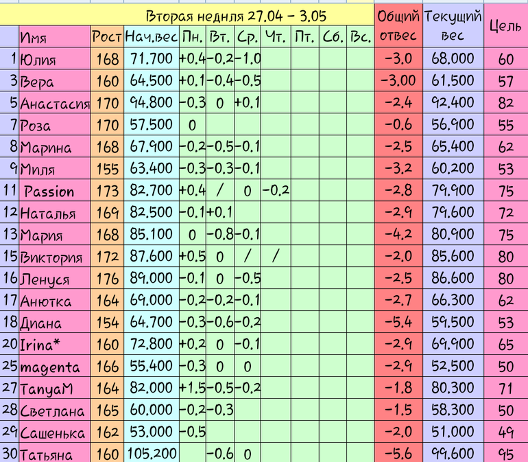 Добрый вечер. Чуть не забыла отчитаться. Я номер 1. Текущий вес 68,9. А в табличке уже 68. )))))ошибочно. Отвес 0,1