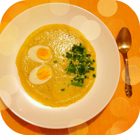 Вареное вкрутую яйцо разрезать на две половинки. И аккуратно положить в суп-пюре.